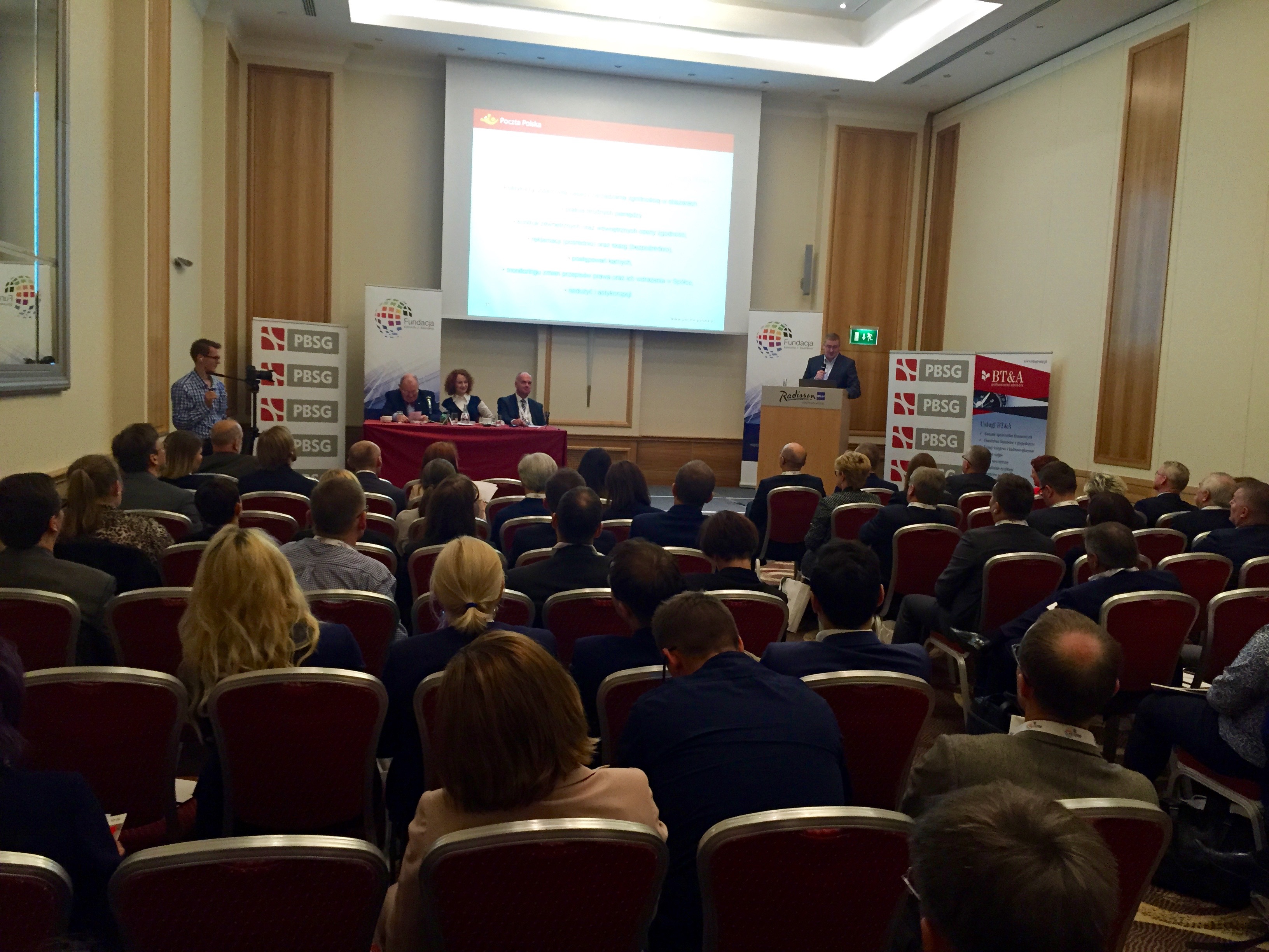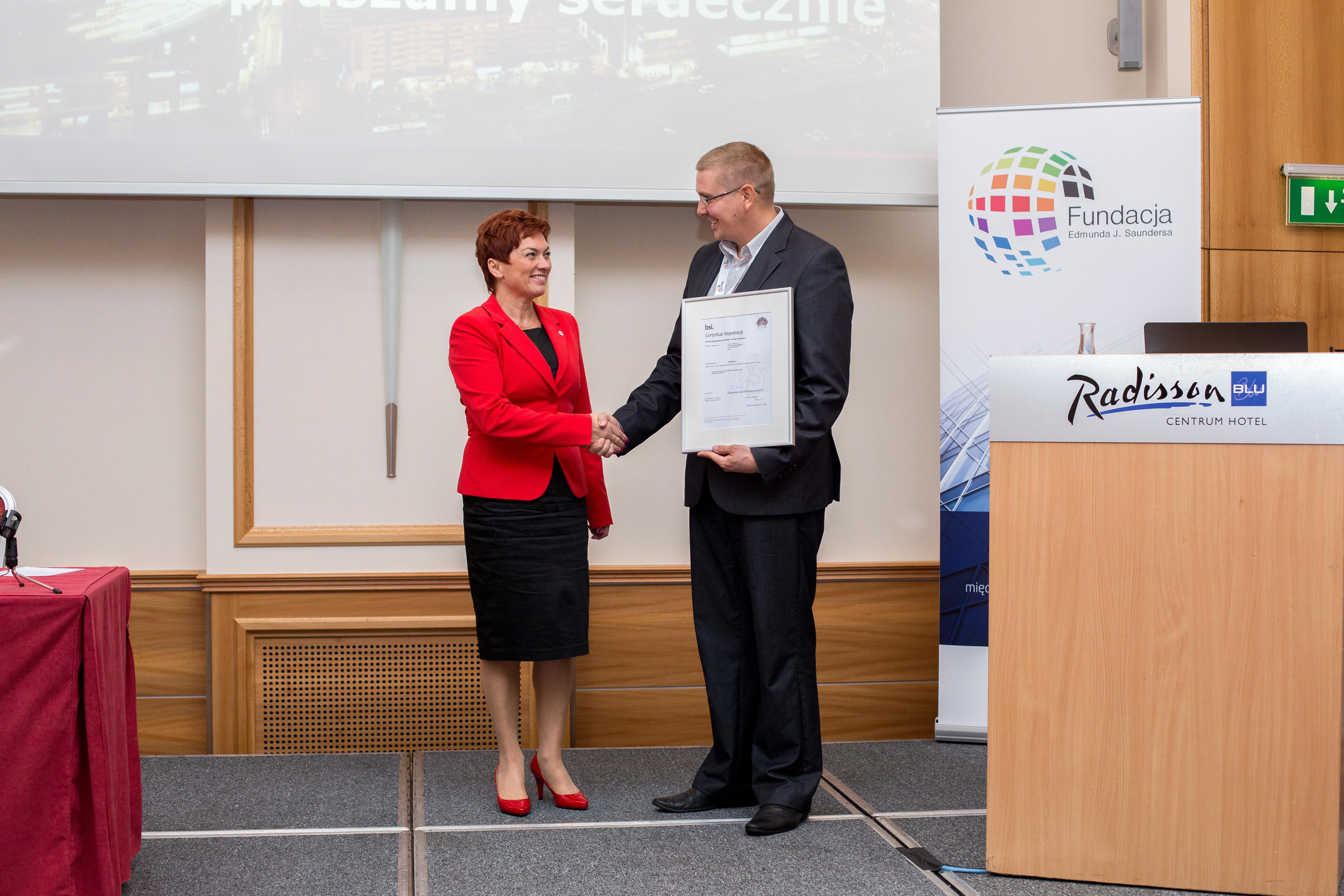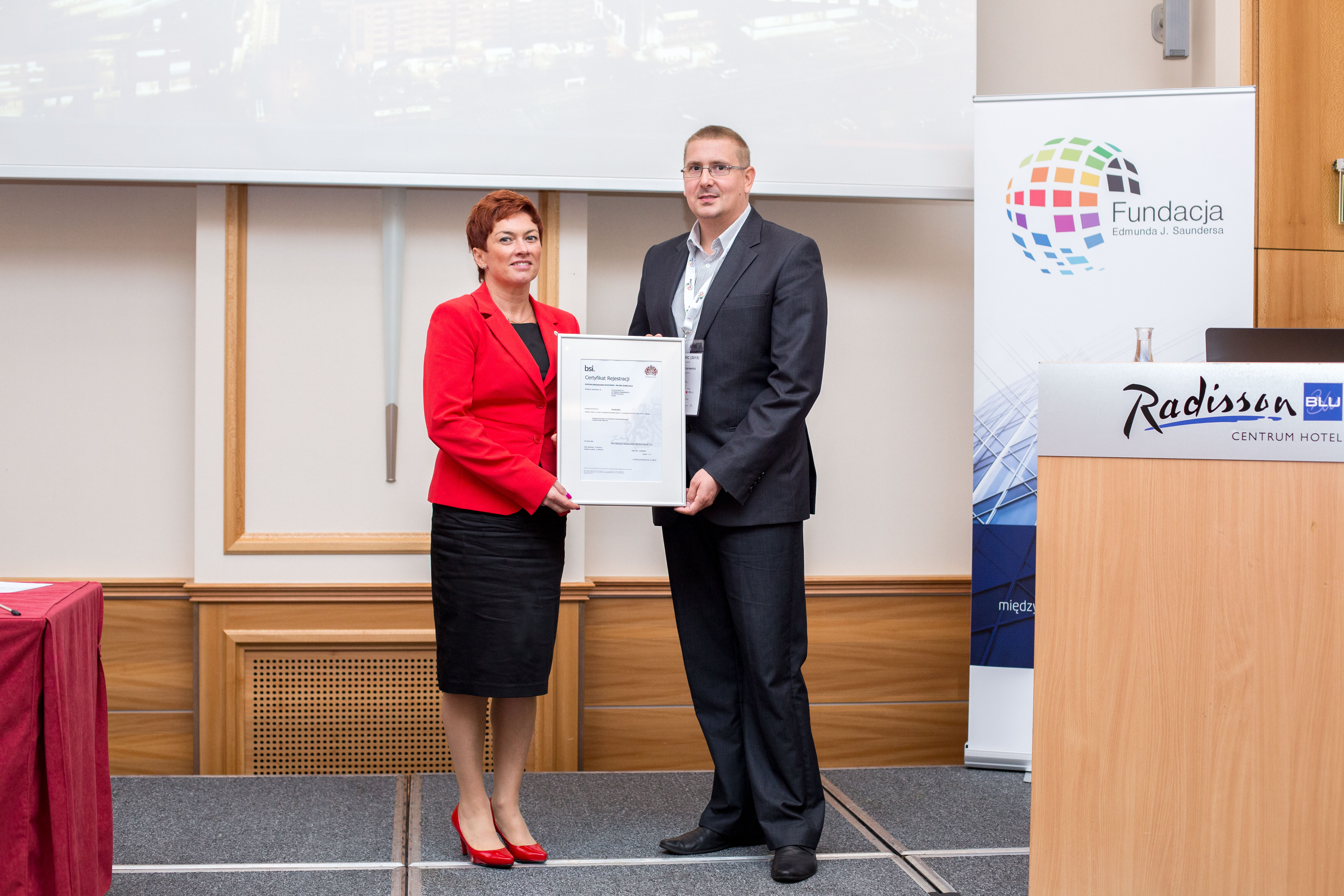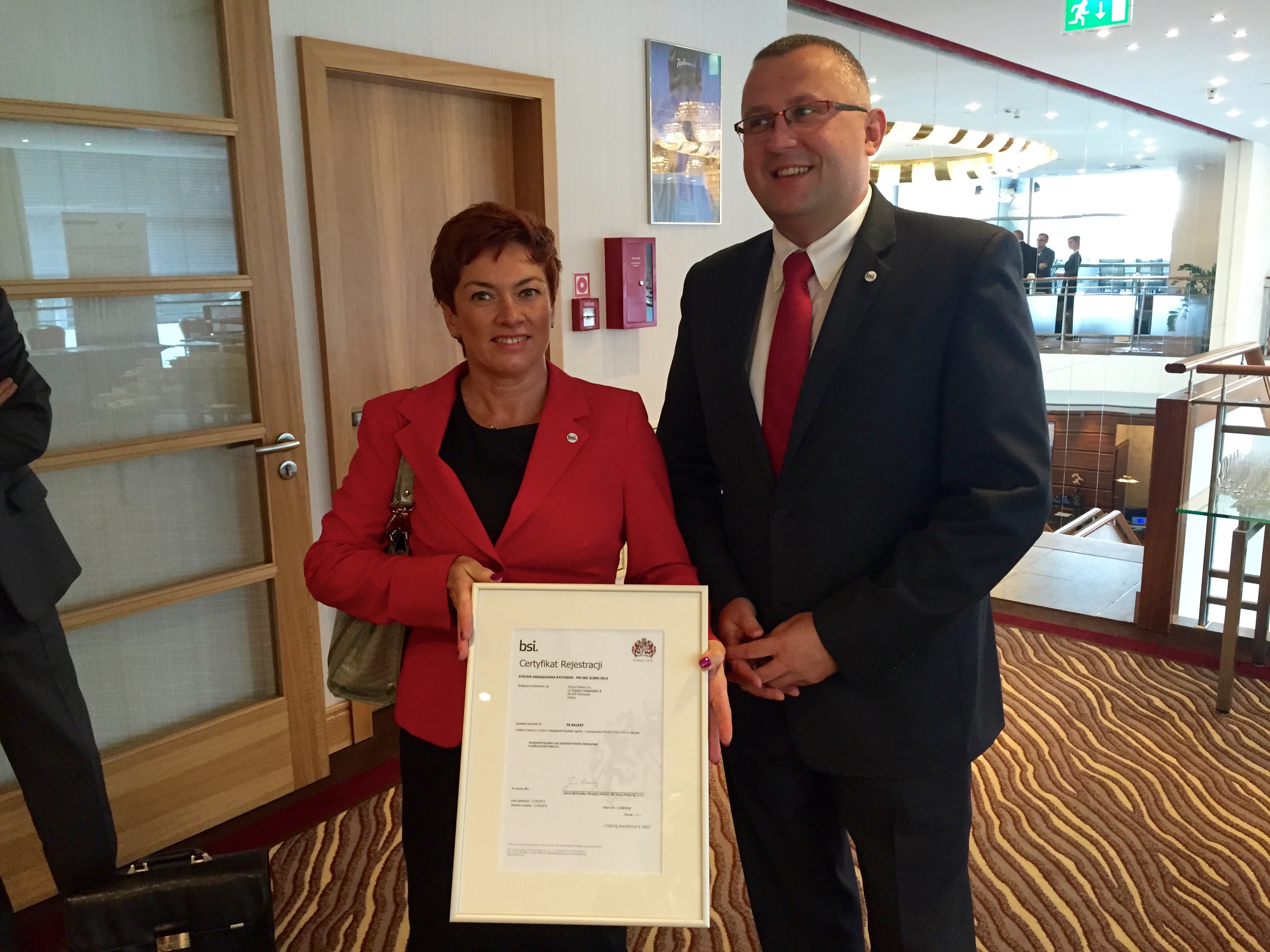 Wydarzeniem I Kongresu GRC 2015 było wręczenie przedstawicielom Poczty Polskiej SA pierwszego w Polsce certyfikatu ISO 31000 potwierdzającego funkcjonowanie Zintegrowanego Systemu Zarządzania Ryzykiem przez niezależną międzynarodową jednostkę certyfikacyjną BSI. Wręczenie certyfikatu poprzedził bardzo ciekawy wykład Pana Andrzeja Wiktorowicza (Poczta Polska SA) w zakresie funkcjonowania GRC w organizacji zatrudniającej 85 tysięcy pracowników. Przygotowanie i wdrożenie systemu z zarządzania ryzykiem wg ISO 31000 w Poczcie Polskiej SA. realizowała PBSG.