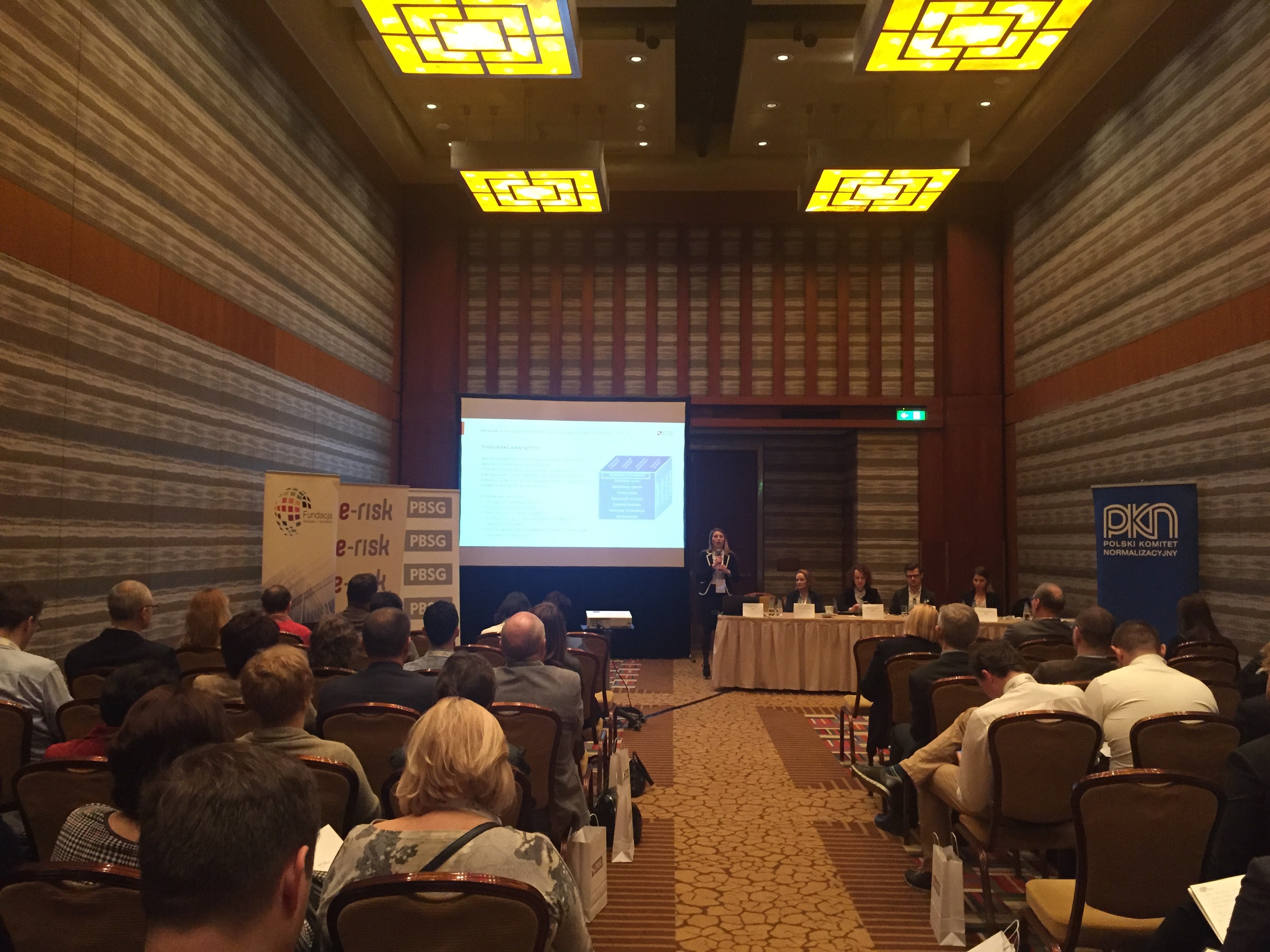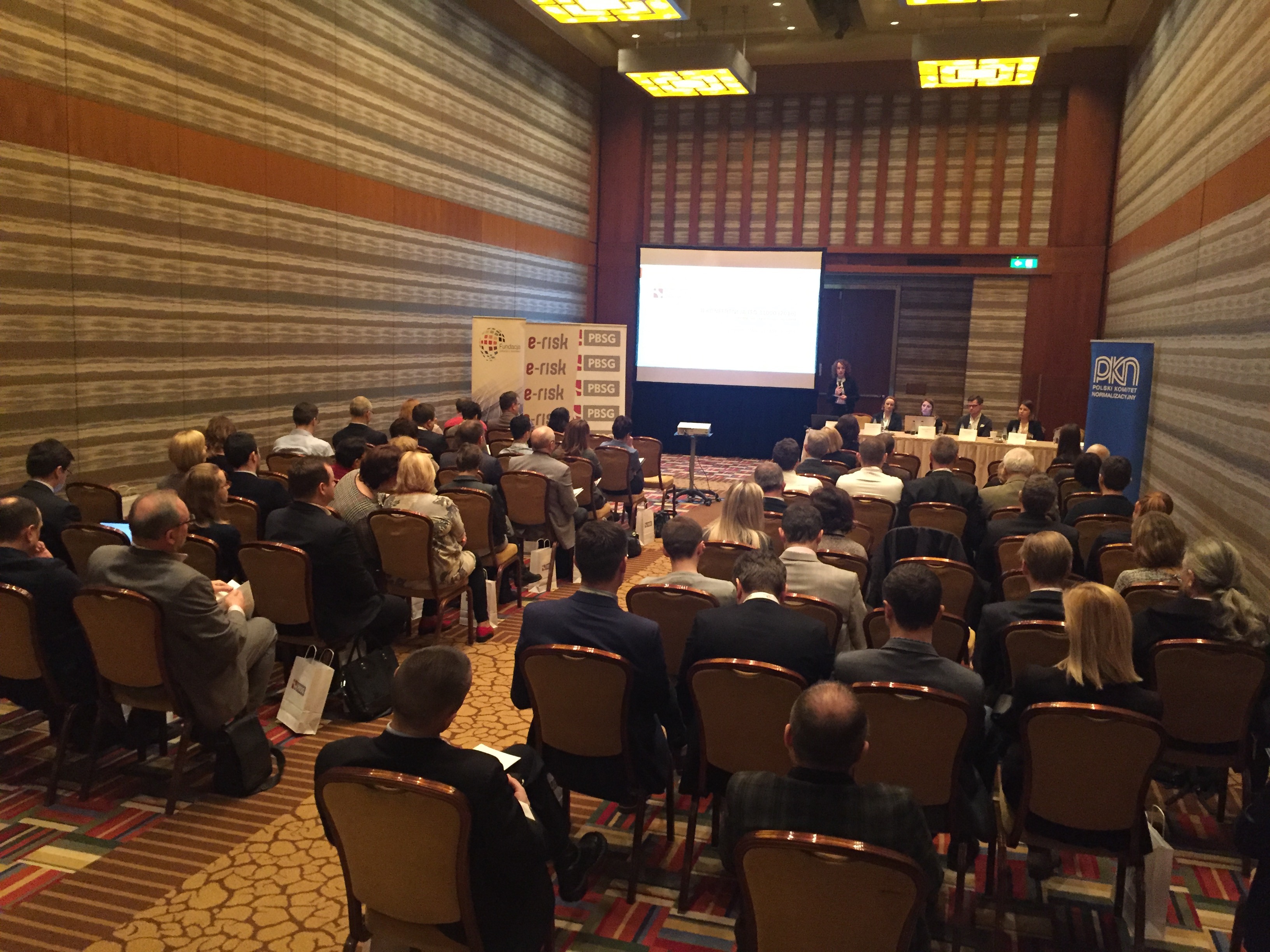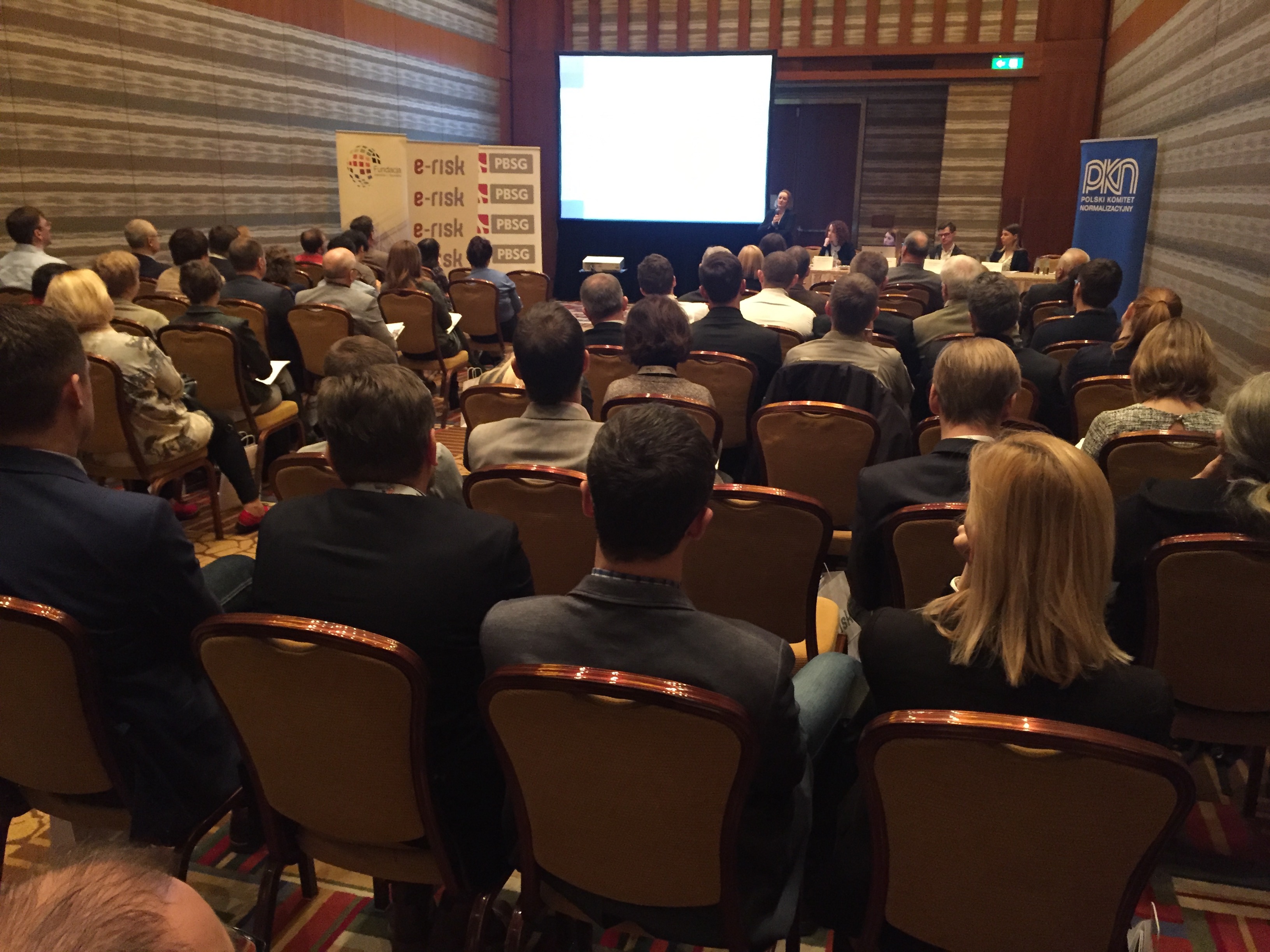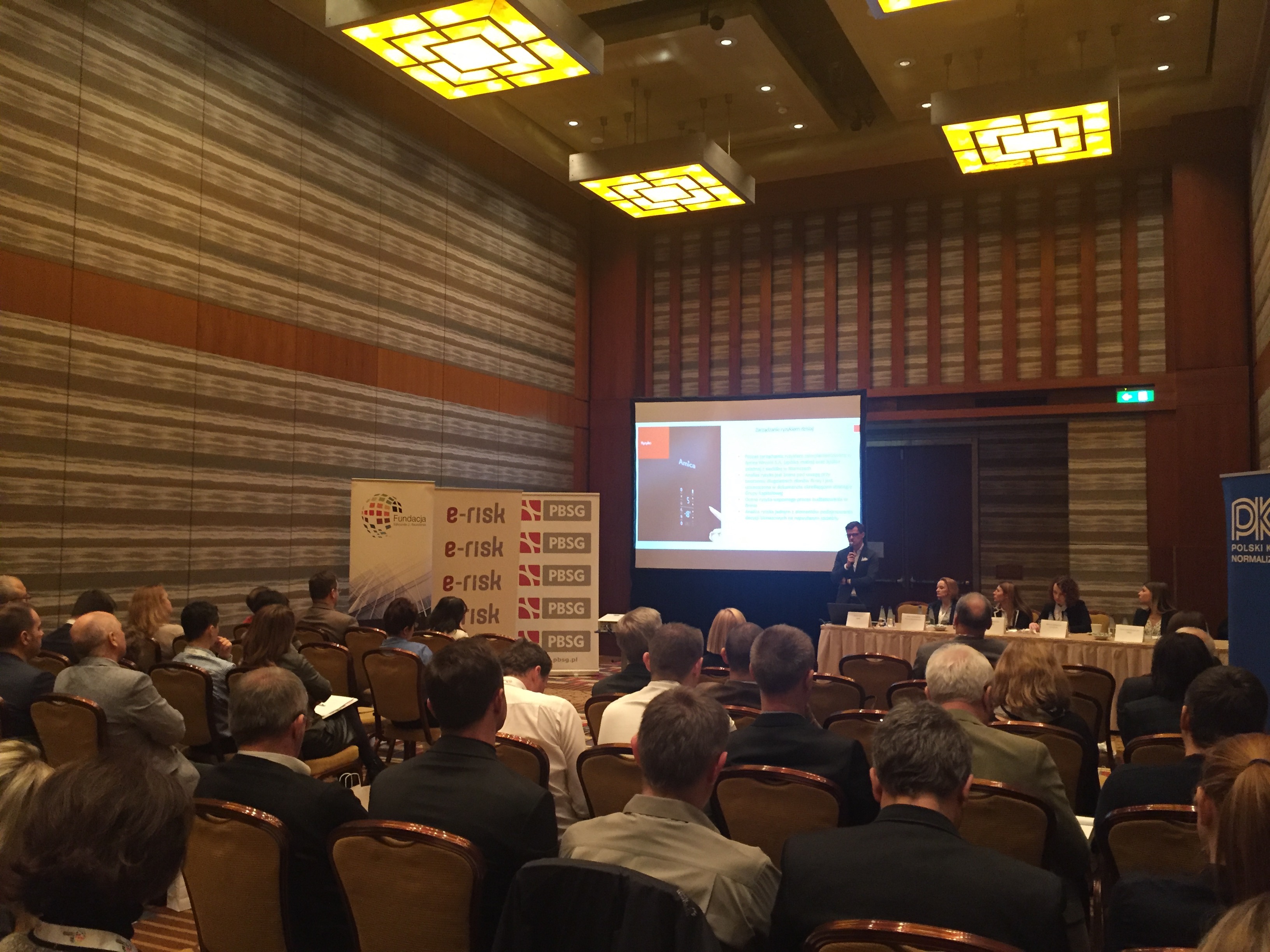 Konferencję rozpoczął wykład Pani Doroty Łobos Dyrektor Departamentu Zarządzania i Ryzyka w PBSG na temat współczesnej roli znormalizowanych systemów zarządzania ryzykiem w zarządzaniu organizacją. Podczas prelekcji wyjaśniono skąd się biorą potrzeby zarządzania ryzykiem w organizacjach sektora prywatnego oraz publicznego, dlaczego tak ważne jest zastosowanie podejścia systemowego oraz problemy z jakimi borykają się organizacje wdrażając system. Uczestnicy dowiedzieli się jakie są podstawowe założenia normy ISO 31000 oraz dlaczego standard ten jest aktualnie najpopularniejszym standardem wykorzystywanym do budowy systemów zarządzania ryzykiem w Polsce i na świecie.